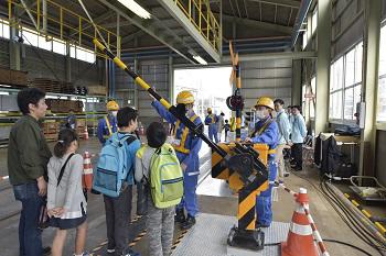 鉄道の安全(あんぜん)を守る車も見学してもらいました。黄色い車は線路(せんろ)を点検するマルチプルタイタンパー、もう1つはふつうの道路(どうろ)と線路の両方を走ることができる軌陸車(きりくしゃ)だ!